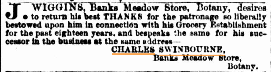 In looking up Charles' details on Trove there is reference to a Charles Richard Swinbourne who was an Alderman of the Botany Municipality from 1888 to 1892 and Mayor from 1891 to 1892. He was apparently instrumental in setting up the municipality and is likely the same Charles Swinbourne who took over the Banks Meadow Store in 1886 as referenced in the following advert from the SMH in June of that year.